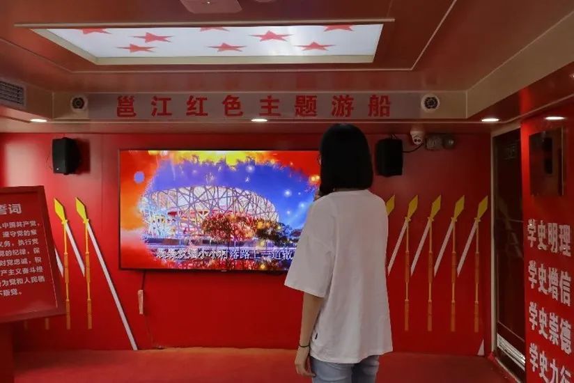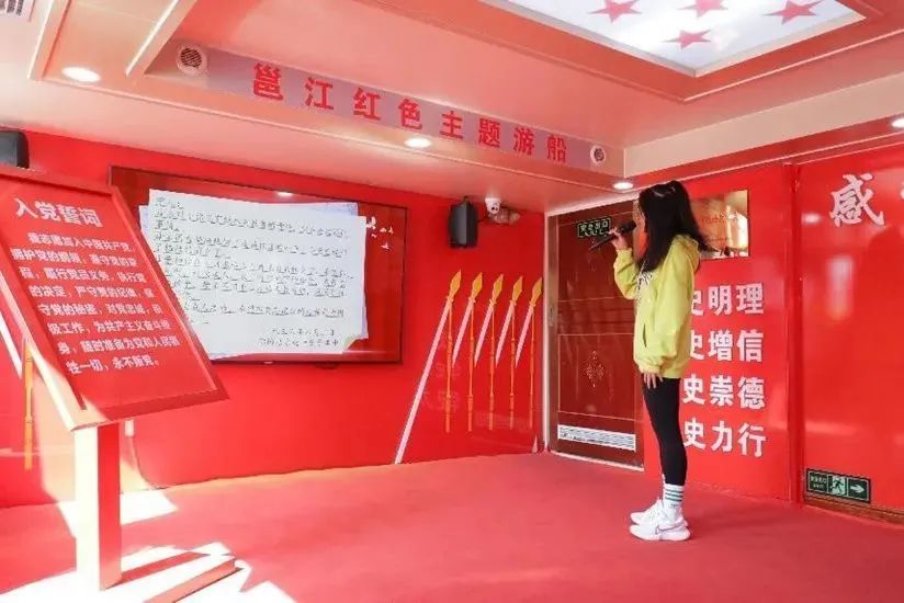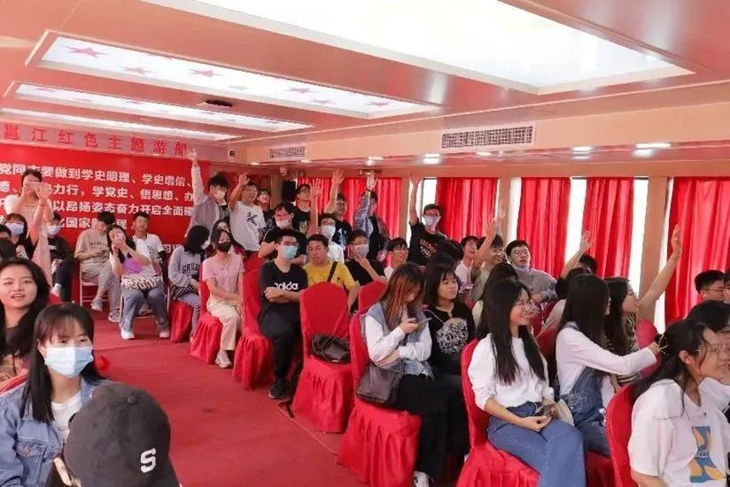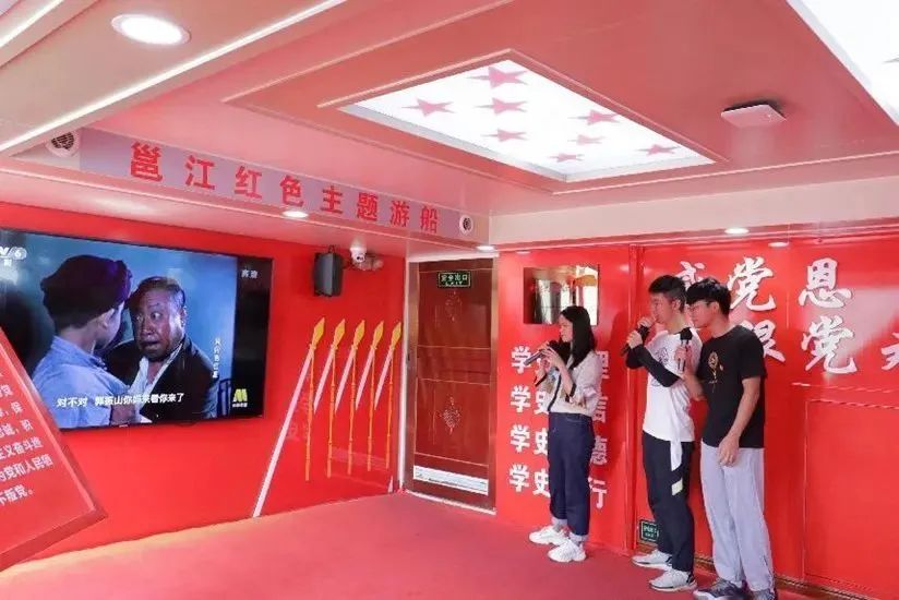 最后,党员们回到游船的第一层船舱进行“邕江红色主题游船”的主题党史教育。党员们热情高涨,积极参与红色家书朗诵、党史知识问答、《小兵张嘎》《闪闪的红星》红色影视剧配音、《没有共产党就没有新中国》《我和我的祖国》红色歌曲大家唱等活动,从中感受红色情怀,汲取青春奋进力量,进一步筑牢师生党员们听党话、感党恩、跟党走的理想信念。