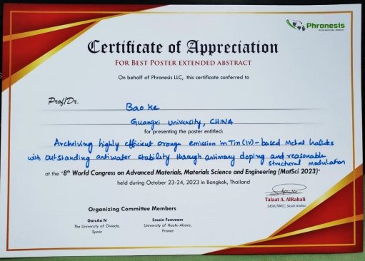 william威廉亚洲经理邹炳锁教授等一行4人应邀出席,其中邹炳锁教授做了题为“Excitation and Optical Properties of Diluted Magnetic Semiconductor Nanostructures”的邀请报告。博士研究生科宝展示的墙报“Achieving Highly Efficient Orange Emission in Tin (IV)-based Metal Halides with Outstanding Anti-water Stability through Antimony Doping and Reasonable Structural Modulation”获最佳墙报奖。