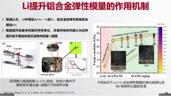 报告从铝合金的基础性能切入,介绍了集成计算材料工程实验室的工作内容,讲解了ICME的研究背景需求与现状以及高强铝锂合金设计理论突破和工艺创新,并且对高强铝锂合金未来应用进行展望。王俊升教授还向参会师生讲解了铝锂合金中锂提升铝合金模量的作用机制以及铝锂合金铸造易产生热裂的本质原因,为师生了解铝合金设计加工主要问题及重要技术路线提供了参考。