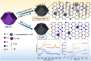 本团队将廉价的NaCl与钴金属有机框架(ZIF-67)进行物理研磨后在N2气氛中高温炭化,通过熔盐辅助热处理方法合成了表面自催化生长 CNTs的碳多面体(CNT@CoNC-5)。此外,在不添加NaCl的情况下,直接热解 ZIF-67 制备了 CoNC作为对比样品。通过SEM和Raman等表征发现,NaCl 在高温下作为限制模板,不仅促进了CNTs在碳多面体表面的生长还提升了碳的石墨化程度,促进电子转移。这有利于加速 PMS 的分解,从而提高盐酸土霉素(OTC)的降解效率,CNT@CoNC-5 催化剂在5min内的表观速率常数高达 66.97 L/g min-1,是CoNC 的 25.46倍。本研究为利用 MOFs 原位合成CNTs复合材料催化降解有机污染物提供了新的视角。