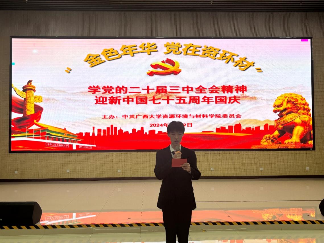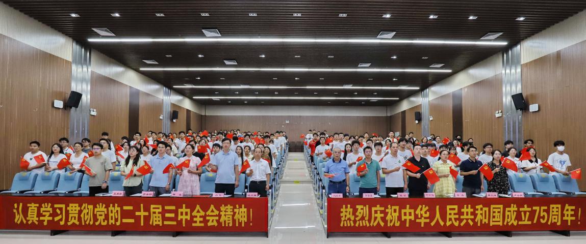 为学习贯彻党的二十届三中全会精神,喜迎中华人民共和国成立七十五周年,9月29日,公司党委组织开展“金色年华·党在资环材”系列活动之“学党的二十届三中全会精神,迎新中国七十五周年国庆”主题党日活动。公司党委书记沈大强,党委副书记、常务副经理冯庆革,副经理罗能能、孙翔出席活动,公司各党支部师生党员代表参加活动。