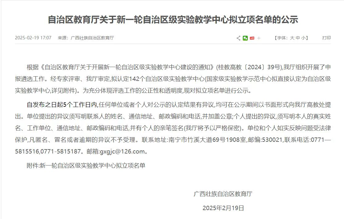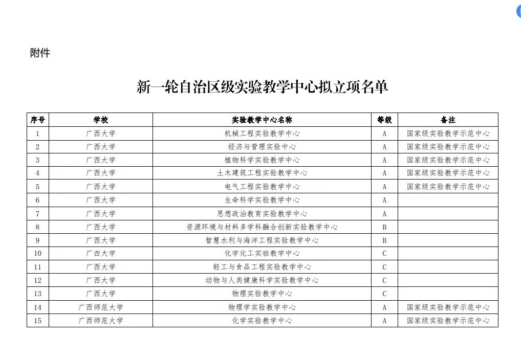 根据《自治区教育厅关于开展新一轮自治区级实验教学中心建设的通知》(桂教高教[2024]39号),区教育厅组织开展了申报遴选工作,经专家评审,区教育厅审定,公司“资源环境与材料多学科融合创新实验教学中心”成功立项为自治区级实验教学中心。