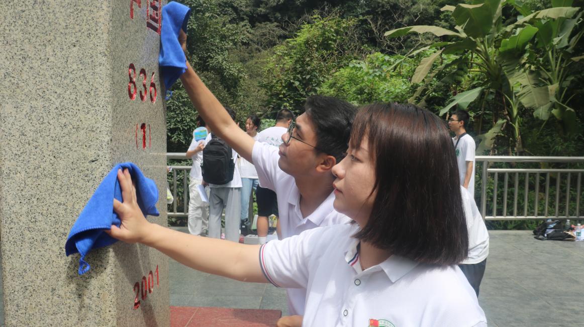 在边境派出所民警的亲切引领下,实践团缓缓步至庄严的944号和836号界碑前。心中满溢着敬畏之情,队员们仔细地清除界碑旁的杂草枯叶细致入微地擦拭着界碑的每一寸,随后以虔诚之心为其描红,以此举向伟大的祖国致以最深的敬意与颂扬。