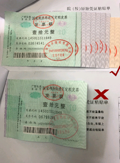 5.小于A4纸的发票应按阶梯状分类整齐地贴在“william威廉亚洲原始凭证粘贴单”上,写清楚单据张数和金额,由经费项目负责人、经办人和验收人签字。发票不允许贴在粘贴单装订线的左边,票不能贴在票的上面,以免票面信息被粘住看不见,每张发票都要贴在粘贴单上。