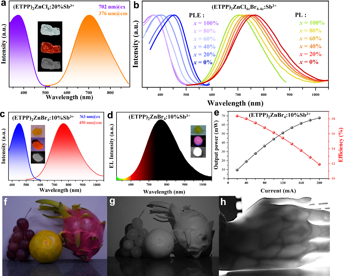 目前,低维无铅金属卤化物由于其可调的发光性质和优异的环境稳定性而获得了广泛的关注,然而其发光主要集中在可见光区域。基于此,团队骨干彭辉带领员工创新性地提出配位结构和卤素取代策略,协同调控低维无铅金属卤化物的光物理性质,成功实现了在蓝光激发下的高效近红外发光,发光效率高达55.4%。随后,将制备的荧光粉与商用蓝光LED芯片相结合,制备了高性能近红外光源,成功展示了其在夜视和生物成像领域中的应用 (Adv. Funct. Mater. 2024, 34, 2411807)。