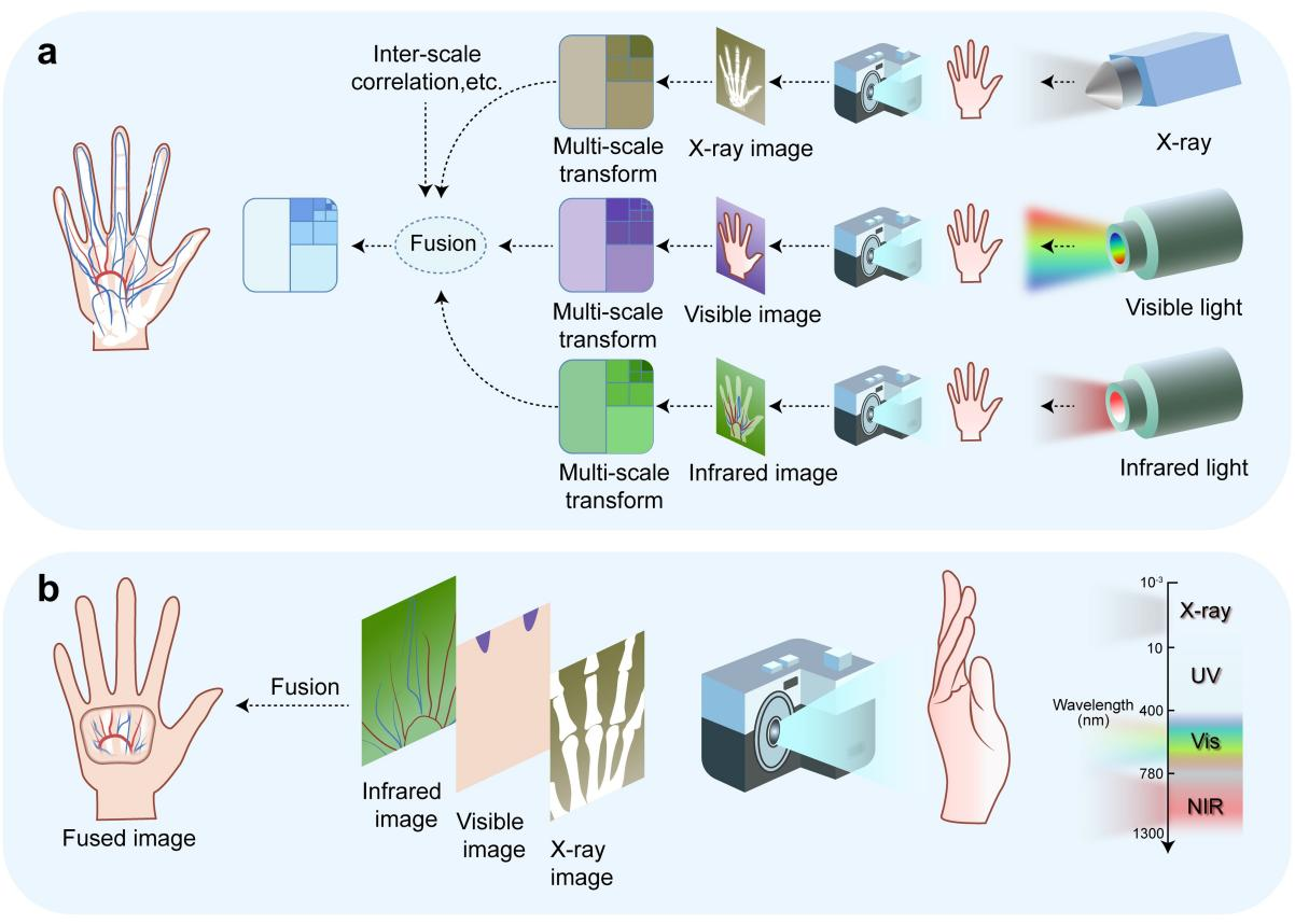 多光谱图像融合技术可以优化和整合不同类型的光谱,以获得更全面、可靠和丰富的特征数据,从而提高模型预测的准确性和稳定性。为此,彭辉等带领员工开发了一种具有超宽发射的新型Sb3+掺杂Zn2+基金属卤化物,成功在单一化合物中实现了高效的白光发射、近红外发射和X射线辐射发光。基于其独特的发光性质,成功实现了其在像素级多光谱图像融合中的应用(Adv. Funct. Mater. 2025, 2424915)。