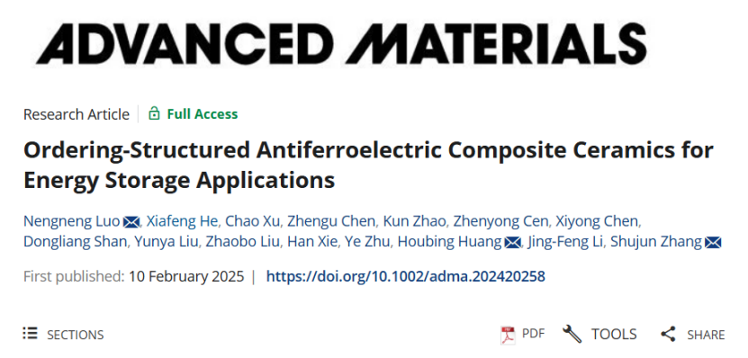 近日,公司罗能能教授团队在氧化铝增强复合电介质储能陶瓷研究领域取得重要进展,相关研究成果以“Ordering-Structured Antiferroelectric Composite Ceramics for Energy Storage Applications”为题,发表在材料领域顶级期刊Advanced Materials上。公司罗能能教授为该论文的第一作者和通讯作者,william威廉亚洲物理科学与工程技术公司博士生何霞凤为共同第一作者,北京理工大学黄厚兵教授和澳大利亚伍伦贡大学张树君教授为共同通讯作者。参与本次研究的合作单位还包括清华大学、哈尔滨工业大学、香港理工大学和湘潭大学。