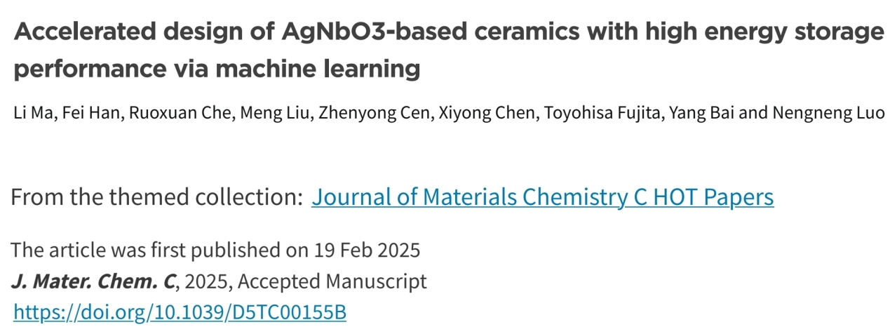近日,公司罗能能教授课题组在利用机器学习指导无铅反铁电储能陶瓷设计领域取得重要进展,相关研究成果以“Accelerated design of AgNbO3-based ceramics with high energy storage performance via machine learning”为题,发表在材料领域期刊Journal of Materials Chemistry C上,并被评选为热点文章。化学化工公司博士生马力和北京科技大学博士生韩飞为该论文的共同第一作者,公司罗能能教授、北京科技大学白洋教授为共同通讯作者。