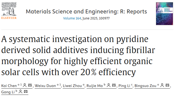 团队课题组在陈凯副教授的带领下,首次系统研究了不同浓度,不同取代基吡啶衍生物固体添加剂在调控D18:L8-BO活性层相分离和结晶度中的作用机制。研究表明当产生部分原纤化结构时可实现最佳性能,二元共混体系效率达19.18%,三元体系效率达20.07%,是目前OSCs报道最高效率的行列之一。