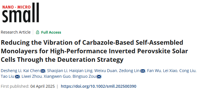 团队课题组在材料设计策略上也进行了大胆创新,首次运用氘代策略设计并合成一种新型自主装空穴传输型材料4PACzd8。基于4PACzd8为空穴传输层的钙钛矿太阳能电池器件实现了24.87%的能量转化效率和杰出的紫外线光照稳定性。该研究表明氘代策略在空穴传输小分子材料的设计中具有重要价值。