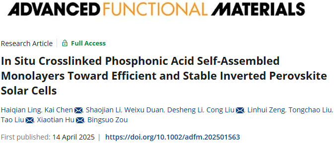 同时,该研究在材料创新方面同样取得显著进展,其首次通过原位自聚合策略与咔唑磷酸自主装分子结合,设计并合成具有原位交联功能的V3PACz新型空穴传输材料,获得高质量的Poly-V3PACz空穴传输层及25.21%的光电转换效率和良好稳定性。该研究对于进一步开发高效稳定的钙钛矿太阳能具有重要的研究意义和应用价值。