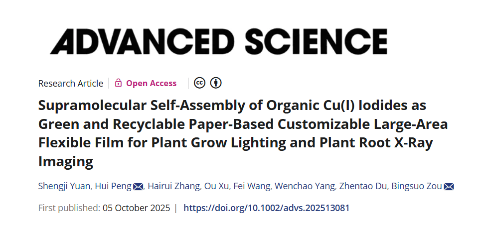 该团队通过超分子自组装策略,成功开发出一种基于滤纸和有机铜碘化物的可定制、大面积、可回收、可生物降解的柔性发光薄膜,并成功构建了一个集植物生长照明与植物根部X射线成像于一体的双功能平台。该研究成果以题为《Supramolecular Self-Assembly of Organic Cu(I) Iodides as Green and Recyclable Paper-Based Customizable Large-Area Flexible Film for Plant Grow Lighting and Plant Root X-Ray Imaging》发表于国际顶级学术期刊《Advanced Science》(IF = 14.1),彭辉博士和邹炳锁教授为共同通讯作者,硕士研究生袁升记为第一作者。william威廉亚洲为第一完成单位。