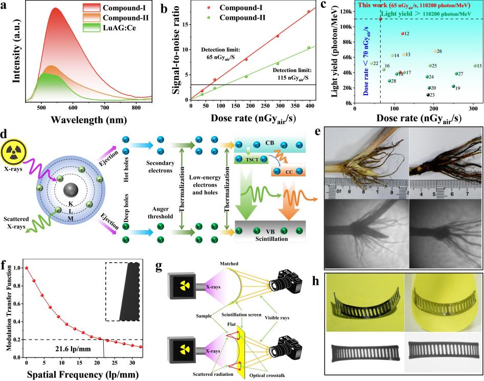 更为突出的是,化合物-I表现出卓越的X射线闪烁性能,其光产额高达110200 photons/MeV,检测限低至65 nGyₐᵢᵣ/s,远超目前多数无铅金属卤化物闪烁体。基于此,团队利用普通滤纸为载体,通过原位生长制备出面积达254.5 cm²的柔性发光薄膜,并且具备优异的可折叠、可裁剪特性。基于该薄膜制备的高性能白光发光二极管,实现高达114.5 lm/W的流明效率,以及作为X射线闪烁屏,实现了高达21.6 lp/mm的X射线成像空间分辨率。